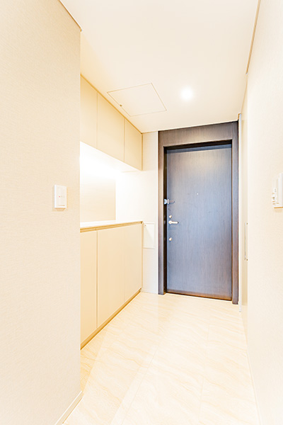 シューズボックスの吊戸棚の下部から、間接照明の柔らかな光が広がっています。カウンターにオブジェや季節の花などを飾り、空間に彩りを添えられます。