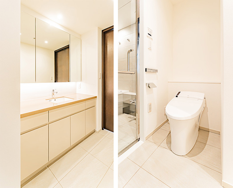 洗面所は、洗面台はシンプルでありながらも、格調の高さが感じられるデザイン。三面鏡の下部にも、間接照明が埋め込まれています。