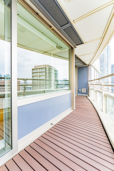 ウッドデッキが施されたバルコニーからは、高層ビル群など都心ならではの眺望が広がっています。