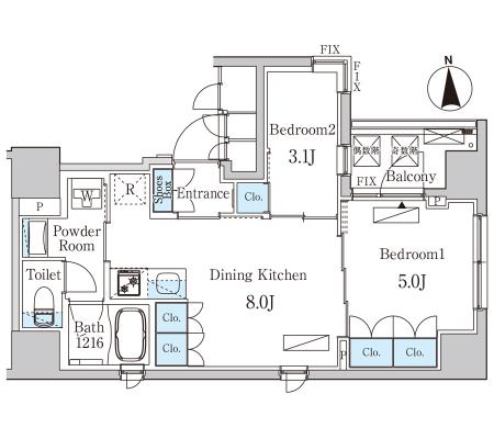 8階 801 215,000円 20,000円 1.0ヶ月 2LDK 42.88㎡ 三井の賃貸 ペット可 フリーレント お問合せ