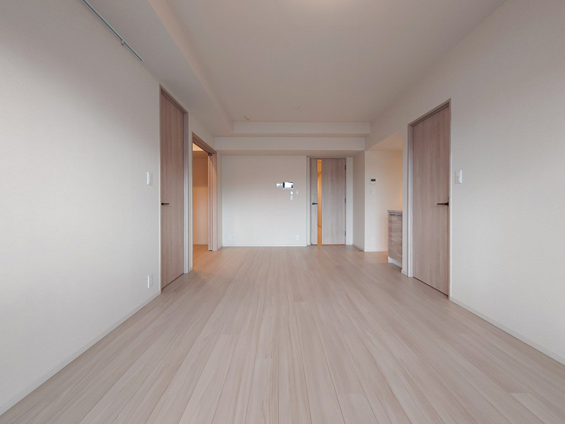 リビングダイニングのドアを背にして、左側にキッチンとベットルーム、右側にサービスルームとベッドルーム2が並ぶつくりです。