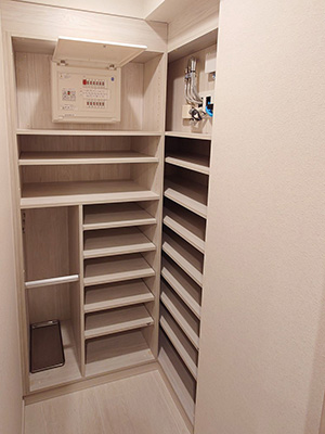 玄関を入って右側にはシューズインクローゼットあります。シューズインクローゼットにはL字型に棚が設けられ、収納力があります。スーツケースを収納する場としても活用できます。