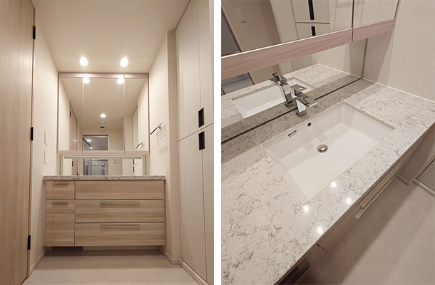 洗面所には洗面台やリネン庫、洗濯機置き場などが設けられています。