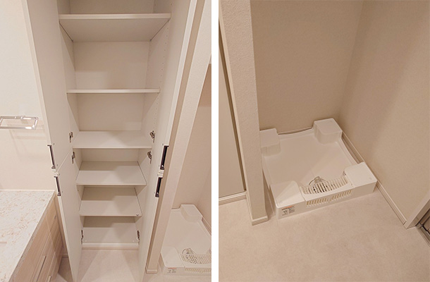 洗濯機置き場には吊戸棚が設置されているなど、豊富な収納スペースが確保されています。