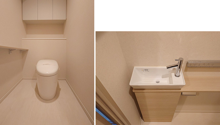 トイレには、タンクレストイレや手洗いカウンター、吊戸棚などが設けられています。
