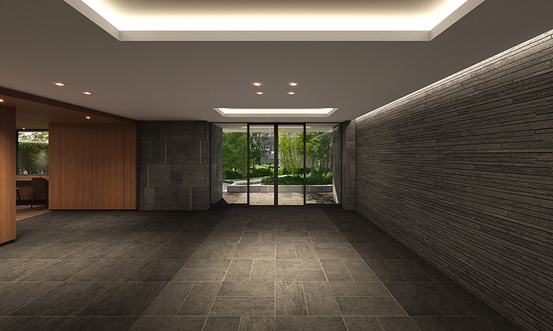 エントランスは重厚感のあるデザイン。開口部から中庭に視線が抜け、空間の広がりが感じられます。