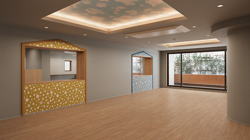 壁一面に大開口が設けられ、開放感があります。折り上げ天井に描かれた青空や雲と、家をかたどったようなデザインのオレンジと水色の室内窓が楽し気な雰囲気をプラスしています。