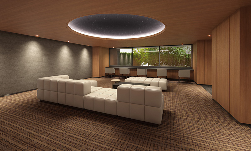 エントランスとゆるやかにつながるラウンジは、間接照明の柔らかな光が放たれた、ホテルライクな雰囲気が漂う空間。窓に面したカウンター席とソファ席が設けられています。