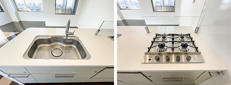 加熱調理機器は、複数の料理の同時調理がしやすい4口のガスコンロ。食器洗浄乾燥機も備えられており、片付けの手間も軽減されます。