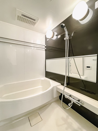 また、隣接する浴室との間にはスタイリッシュなデザインのガラスドアが設置されています。浴室は浴室乾燥機が備えられているなど機能的です。