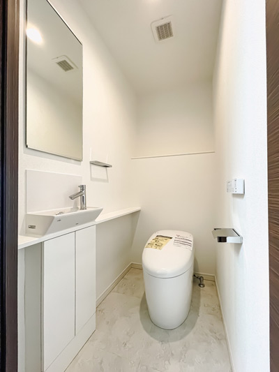 トイレも白を基調としたコーディネートです。タンクレストイレやミラー、手洗いカウンターなどが設置され、ミラーはゲストが身だしなみを整えたいときなどにも便利です。