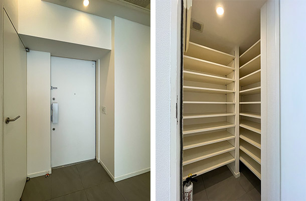 玄関ドアから入って右側にシューズインクローゼットが設けられています。シューズインクローゼットにはL字型に棚が設置されており、収納スペースが充実しています。