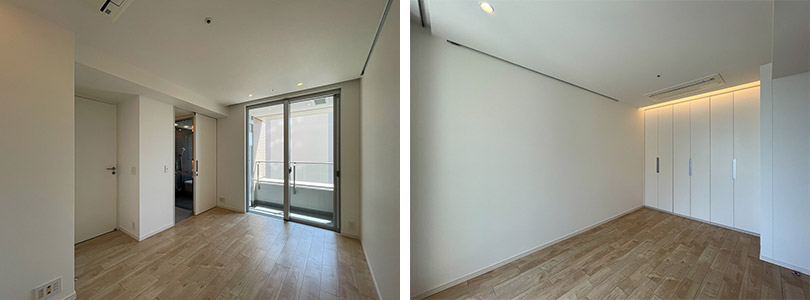 ベッドルームはバルコニー2に面して掃き出し窓が設けられており、開放的な雰囲気です。また、壁面にピクチャーレールが設置され、クローゼットの前には間接照明が設えられているなど、インテリア性の高いお部屋でもあります。