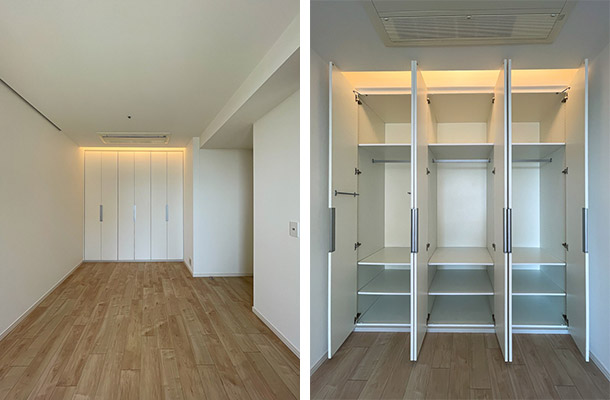ベッドルームには2枚扉のクローゼットが3つ並んで設置されており、収納力があります。