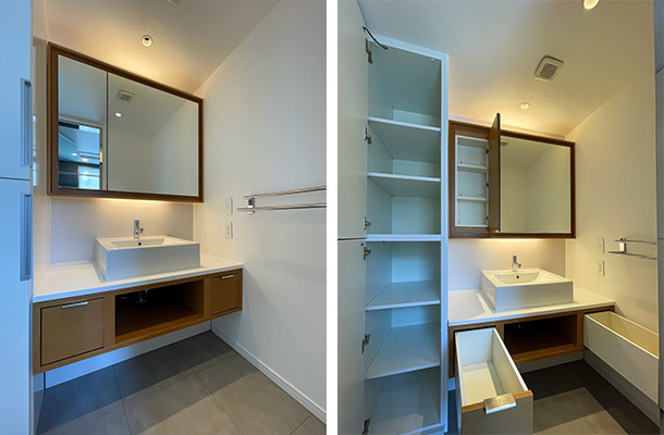 洗面所には洗面台やリネン庫が設けられています。洗面台は「木×白」のモダンなデザインで、足元に空間の空いたフロートタイプです。