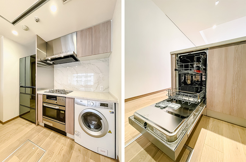 食器洗い乾燥機やオーブン、洗濯機、冷蔵庫 が備えられており、設備機器が充実しているのも特徴です。