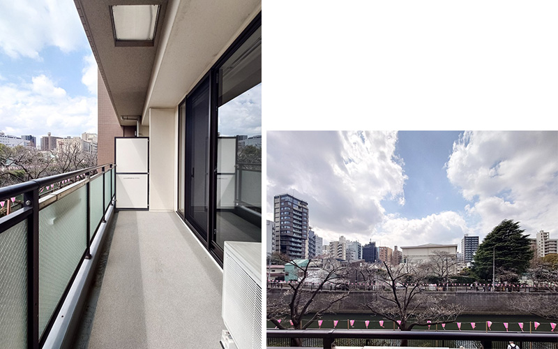 バルコニーでは、春には目黒川沿いの桜を間近で楽しめます。