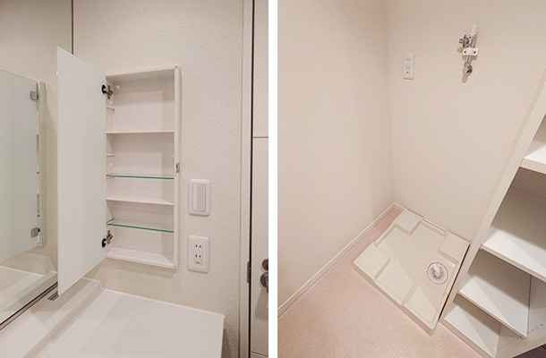 洗面所には洗面台や収納棚、洗濯機置き場などが設けられています。洗面台は、お手入れがしやすい洗面ボウルとカウンターが一体型のタイプです。