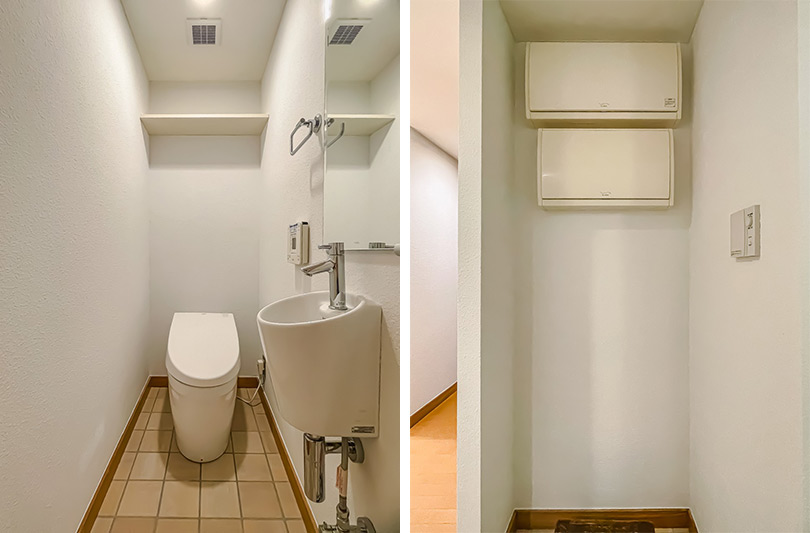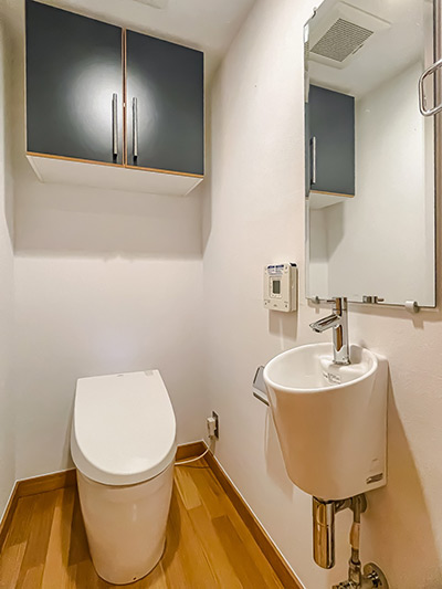 和室の隣の1階のトイレは、タンクレストイレと手洗い器、ミラーのほか、扉付きの吊戸棚が設けられているのが、地下1階のトイレとの違いです。