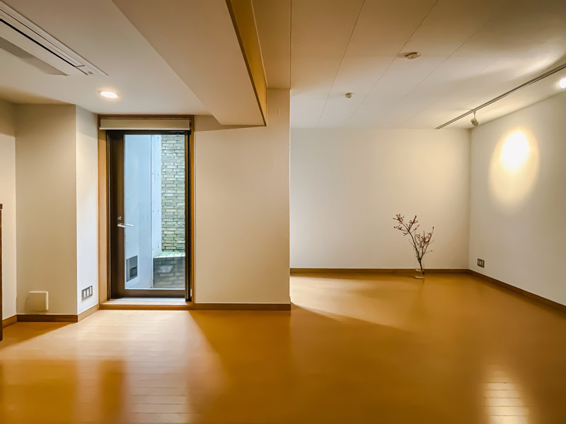 地下1階ではありますが、ドライエリアから自然の光が採り入れられ、空間の広がりが感じられます。壁面を照らすスポットライトが設置されており、光の陰影による趣ある空間です。