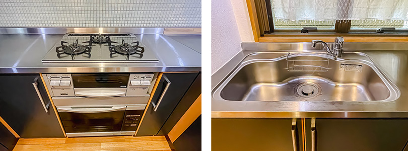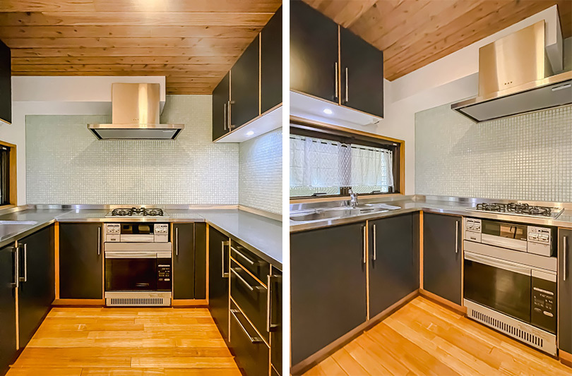 キッチンはU字型で広い調理スペースが確保され、ホームパーティーなどの際の複数人での調理にも向いています。キッチンには3口のガスコンロやオーブン が備えられており、料理の腕を振るえます。