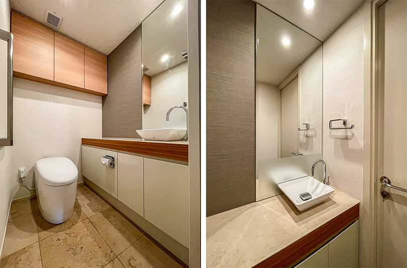 トイレにはタンクレストイレや吊戸棚、手洗いカウンターなどが設置されています。ミラーが取り付けられており、ゲストが身だしなみを整える場としてもお使いいただけます。