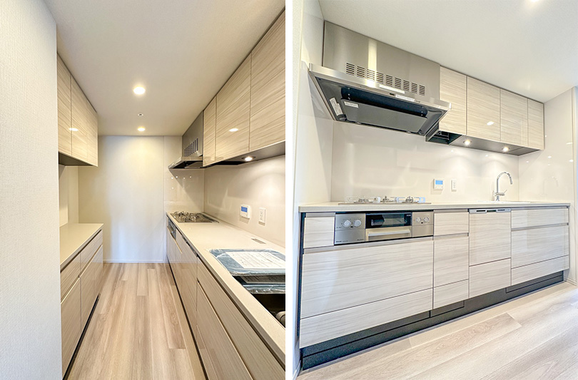 3口ガスコンロやディスポーザー、食器洗い乾燥機などが備えられた機能的なキッチンです。キッチンの背面にはカップボードが設けられており、収納力がありま