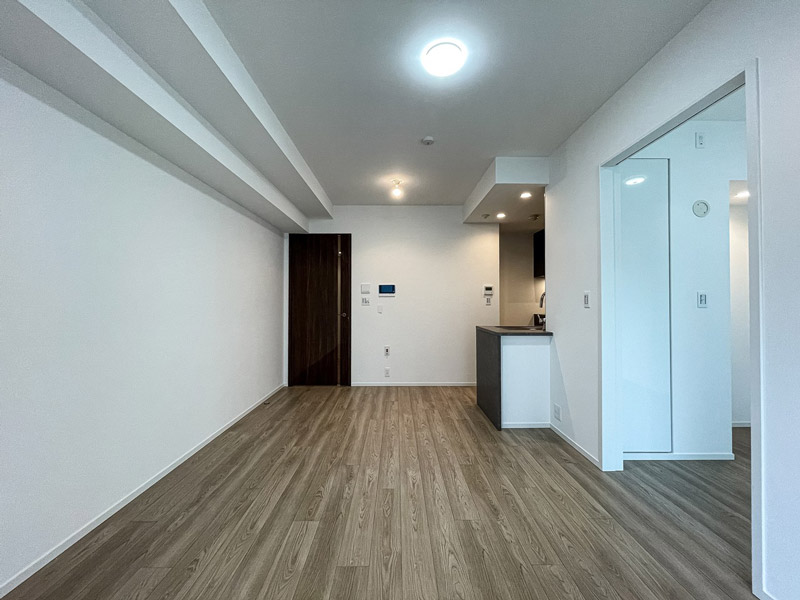 リビングダイニングを入って左側にキッチンがあり、ベッドルームも隣接して設けられています。
