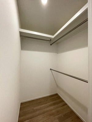 また、ウォークインクローゼットが備えられ、広さは1.3帖です。ウォークインクローゼットには枕棚とハンガーパイプがL字型に設置されています。長辺側のハンガーパイプは上下二段に取り付けられており、収納スペースを有効に使えるように配慮されています。