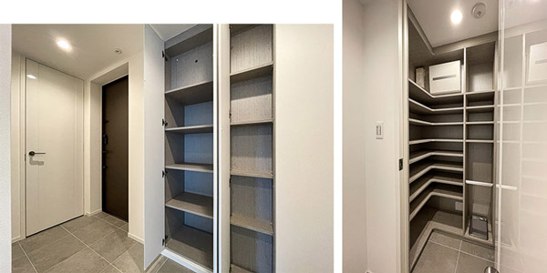 玄関を入って右側にシューズインクローゼット、廊下には物入れが設けられており、豊富な収納スペースが確保されています。
