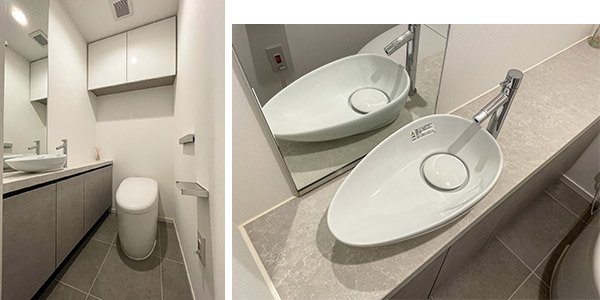 トイレにはタンクレストイレや吊戸棚、手洗いカウンターなどが設けられています。手洗い器はスタイリッシュなデザインで、空間のアクセントになっています。