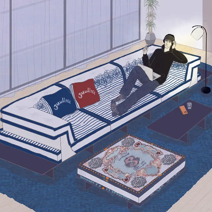 自宅兼プライベートスタジオを借りるうえで必ず手に入れたいと思っていたのは、インテリアをラグジュアリーな雰囲気に整えてくれる床座のように低い位置でくつろげるソファ。なかでも、ファッション業界のオートクチュールと同じような手間と技術で、イタリアの職人によってハンドステッチで仕上げられた「マジョン」は、芸能人御用達の人気アイテムだ。座る姿は、まるでハイファッションに身を包むような映え方をする。一流メゾンの中でも、特に繊細なグラフィックが特徴のゴルチエのシリーズを選んだ。この世界観で音楽を聴くと気分が高揚する。華やかさだけでなく機能性も抜群。自由に組み合わせて簡単に模様替えできる手軽さと、半畳単位でスペースを考えられる身体的なサイズ感が唯一無二のデザインだ。自宅から配信をするにも画角を自由にレイアウトできて都合がいい。どうレイアウトしても映えるのも魅力だ。